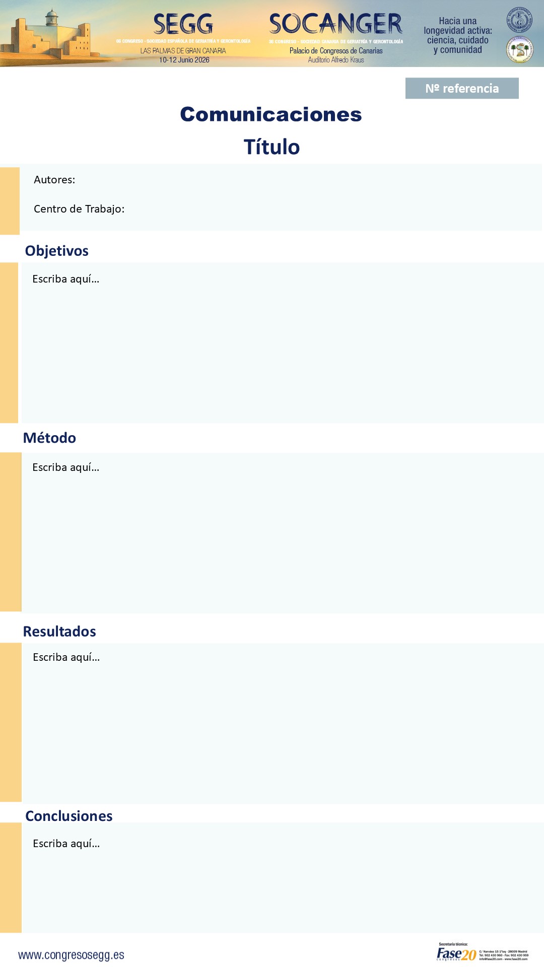 La Organización del Congreso ha puesto a su disposición una serie de plantillas en formato Power Point con el fin de que elabore su póster en base a dichas plantillas si bien no son de uso OBLIGATORIO. Les recordamos que el poster debe tener los mismos contenidos referidos en el resumen y la estructura que figure en la normativa.